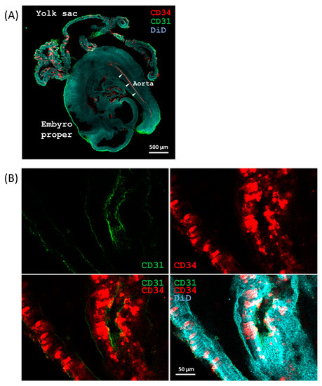 Whole mount immunofluorescence staining of an E10 murine yolk sac and embryo. (A) A set of E10 yolk sacs and embryo proper were whole mount stained with CD31 and CD34 antibodies to locate the vascular endothelia and HECs. The ventral side of the aorta which was revealed by the line of CD34 signal, is indicated by arrow heads. (B) Image of the yolk sac with higher magnification performed to unveil the rectangular and round shapes of CD34+ cells which were present in CD31 defined tubular structures in the yolk sac.
