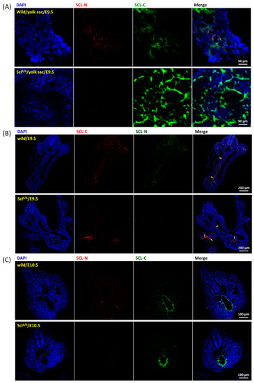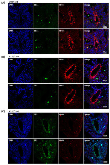 The definitive hematopoietic stem cells were generated from HECs [7,8,28,29]. In comparison with the other types of vascular endothelial cells, CD34 is a quite specific marker for hemogenic endothelium and CD31 is a general marker for all [30]. In vitro differentiation experiments concluded that CD43 defined definitive hematopoietic stem/progenitor cells from human embryonic stem cells [31,32]. Unlike the SCL-S, all the CD31, CD34, and CD43 markers were still not observed on the endothelial layer of E9.5 aorta (Figure 4A), instead, dispersed CD31+/CD34+/CD43+ cells were found in the vessel cavities (Figure 4A,B) and weak but significant c-Kit and CD45 markers were revealed on most of these cells (Figure 4C). Such data suggested that the dispersed cells were hematopoietic progenitor/stem cells. At E10.5, significant CD34 and CD43 signals were shown on the endothelial layer of wild-type and heterozygous SCL+/Δ aorta accompanied by a few dispersed CD31+/CD34+/CD43+ cells in the nearby cavities (Figure 5A,B). Nonetheless, CD31 signals were detected in a limited manner on the endothelial layer of homozygous SCLΔ/Δ aorta (Figure 5C).