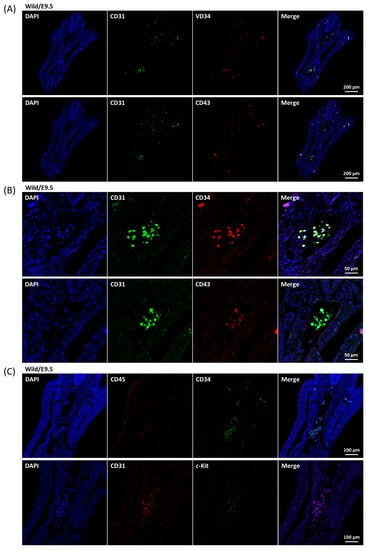 Expression patterns of CD31, CD34, and HSC markers in E9.5 wild-type embryo. (A) Besides the SCL-C and SCL-N, the wild-type transverse E9.5 embryonic sections were prepared and co-incubated with either CD31 and CD34 (upper panels) or CD31 and CD43 (lower panels) antibodies. Only the dispersed cells were stained. (B) Image at higher magnification focusing on the major groups of the dispersed cells. (C) The wild-type transverse E9.5 embryonic sections were co-incubated with either CD34 and CD45 (upper panels) or CD31 and c-Kit (lower panels) antibodies.