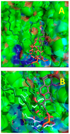 Figure 2. BABS with the ligand and adjacent endogenous lipid. (A) The BABS region from the mitochondrial dimeric CcO structure (PDB entry 5B1A) is depicted as a protein surface. The endogenous phosphatidylethanolamine molecule is shown by dark green sticks. Decyl maltoside (brown sticks) from R. sphaeroides’s CcO structure (PDB entry 3DTU) is superimposed on the image in the appropriate location. The cholate molecule (grey sticks) is bound in the hydrophobic cavity formed by subunits I, II and VIa (from the opposite monomer). Side view, matrix is at the bottom. Oxygen and nitrogen atoms are colored in red and blue, respectively. (B) The same (except for the detergent from the bacterial enzyme structure), but enlarged. The residues of subunit VIa, presumably involved in interactions with cholate (Arg14, Arg17, Phe18 and Phe21), are indicated and tinted in white.