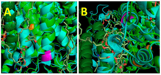Figure 3. Binding sites for amphipathic ligands in mitochondrial CcO. (A) Side view. (B) View from the inner membrane surface. The structures of the dimer (formed by light green and a deep green monomers; PDB entry 3ASO) and the monomer (cyan; PDB entry 5Z62) are superimposed. In the center of the image in (B), one can see the NDUFA4 subunit, which is present only in the monomeric structure and is involved in the regulation of the monomer–dimer transition [56]. Lipids are grey, with red O and blue N atoms. BABS is marked by E62II, colored in purple. SBSM is marked by M278I, colored in orange. The distance between E62II and M278I (yellow dashed line) is 20 Å. The cholate bound in BABS is grey with red oxygens. The distance from cholate’ hydroxyl 7 to carboxyl of E62II is 2.8 Å, and the nearest distance from the cholate to M278I is about 8 Å.
