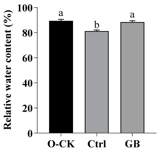 Effects of GB on relative water content (RWC) in B. rapa under heat stress. Data are shown as mean ± SD. Different lowercase letters indicate significant difference at p < 0.05. O-CK, optimum conditions, foliar sprayed with water; Ctrl, foliar sprayed with water before exposure to heat stress; GB, foliar sprayed with GB before exposure to heat stress.