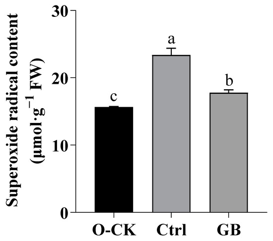 Effects of GB on O2·− in B. rapa under heat stress. Data are shown as mean ± SD. Different lowercase letters indicate significant difference at p < 0.05. O-CK, optimum conditions, foliar sprayed with water; Ctrl, foliar sprayed with water before exposure to heat stress; GB, foliar sprayed with GB before exposure to heat stress.