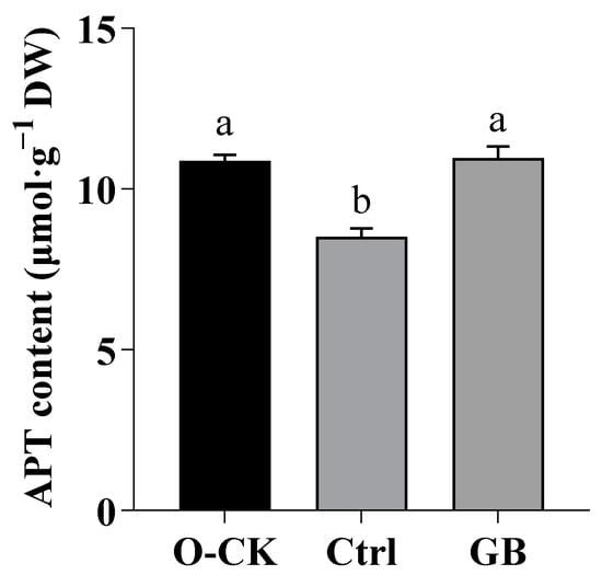 Effects of GB on ATP content in B. rapa under heat stress. Data are shown as mean ± SD. Different lowercase letters indicate significant difference at p < 0.05. O-CK, optimum conditions, foliar sprayed with water; Ctrl, foliar sprayed with water before exposure to heat stress; GB, foliar sprayed with GB before exposure to heat stress.