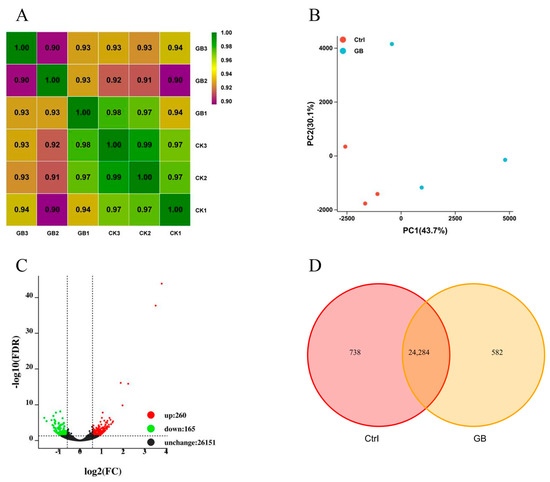 RNA-Seq data analyses. (A) Heatmap of correlations between samples in different treatments showing three GB and three control (CK) groups. Each value in the heatmap is a Pearson’s correlation coefficient. (B) PCA analysis plot displaying all 6 samples along the axes of PC1 and PC2, which describe 43.7% and 30.1% variability, respectively, within the expression dataset. (C) Volcano plots of the overall DEGs distribution. Threshold was set as an adjusted p-value (Padj) < 0.05 in GB relative to Ctrl. X-axis depicts fold change (FC) in gene expression where the smaller the value, the higher the expression relative to Ctrl. Y-axis depicts false statistical significance of false discovery rate (FDR), where the bigger the value, the smaller the ratio of the number of false positives to the number of total positives. Significantly up-regulated and down-regulated genes are indicated in red and green, respectively. Genes that were not differently expressed are depicted in black. (D) Venn diagram of expressed genes in GB and control under heat stress.