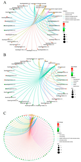 In order to validate our transcriptome data, qRT-PCR was performed on 9 DEGs in the KEGG pathways (Figure 7). HSPs constitute the first line of protection for cells exposed to a variety of stressful conditions by reversing unfolding or inhibiting denaturation and aggregation of cellular proteins as molecular chaperones. We found 6 genes related to HSP from the RNA-seq dataset. There were genes for 3 heat shock proteins and 3 antioxidant enzymes, which were BraA03g005240.3.1C, BraA01g018430.3.1C, BraA01g015830.3.1C, BraA05g010980.3.1C, BraA01g023980.3.1C, and BraA05g031030.3.1C. Three genes (BraA08g025430.3.1C, BraA03g050640.3.1C, and BraA04g029450.3.1C) appeared many times in carbon metabolism, pentose phosphate pathway, glutathione metabolism, sulfur metabolism, MAPK signaling pathway-plant, and plant hormone signal transduction pathway. The results of qRT-PCR showed a similar expression profile to those from the RNA-Seq data (Table S5). These results independently confirmed that high coverage of transcriptome data is reliable.