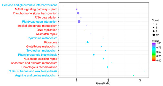 KEGG pathway enrichment analysis. The vertical axis represents the pathway name, and the horizontal axis represents the gene number ratio of significant DEGs to the total genes in a given KEGG pathway. The size of the dots indicated by “Count” represents the number of DEGs in the pathway, and the color of the dots corresponds to the different q-value ranges. The figure shows the top 18 pathways with q-values. Red and blue letters indicate more than 50% up-regulated and down-regulated DEGs out of a total number of DEGs, respectively.