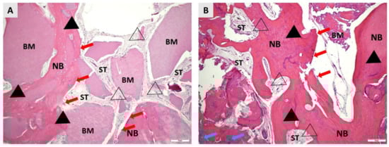 Representative photomicrographs of biopsies taken four months after alveolar ridge preservation. (A) shows details of the bone augmented with autologous dentin graft (ADG), whereas (B) shows details of bovine xenograft mixed with autologous bone. In both groups, the remaining biomaterial particles (BM and blue arrows in (B)) are in close contact with the newly formed bone (NB). NB has a regular, lamellar appearance in both groups and is filled with osteocytes (black fill triangles) embedded in lacunae. Osteoblasts (red arrows) are clearly visible at the margins of NB. The soft tissue areas (ST) are rich in cells, especially fibroblasts (no fill triangles). No inflammatory tissue reaction was detected in either group (hematoxylin-eosin, 100× magnification).