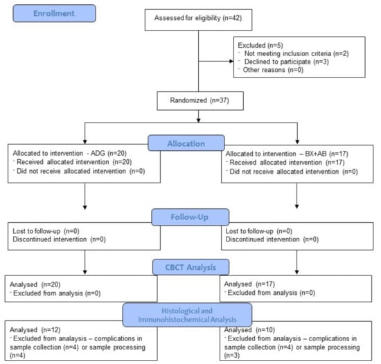 A relatively new graft material for bone regeneration is autologous dentin. In 1967, Yeomans and Urist demonstrated the presence of bone morphogenetic proteins (BMPs) in dentin, providing the first known evidence of the osteoinductive potential of the demineralized dentin matrix []. The only signaling molecules that can independently induce de novo bone formation at orthotopic and heterotopic sites are BMPs, and their presence in dentin distinguishes it from xenogeneic biomaterials that do not contain proteins [,]. Due to the development of technologies that facilitate the clinical application of dentin, it has been increasingly used as an augmentation material since 2008 []. The osteoconductive and osteoinductive properties of autologous dentin were determined in studies using an experimental animal model that demonstrated osteoconduction, integration and resorption of autologous dentin [,,]. The use of autologous dentin in combination with platelet-rich fibrin was evaluated radiographically with cone beam computed tomography (CBCT) analysis []. A recent clinical study compared the clinical and histologic outcomes of augmentation of alveolar bone defects with autologous dentin and bovine xenograft []. Nevertheless, there is a knowledge gap regarding the osteogenic potential of autologous dentin, especially regarding the expression of inflammatory and osteoinductive factors in bone tissue after the application of autologous dentin in the alveolar socket. Therefore, the aim of this randomized controlled clinical trial was to investigate the clinical and radiographic efficacy, as well as the histological and immunohistochemical properties, of autologous dentin in alveolar ridge preservation and to compare it with bovine xenograft mixed with autologous bone.