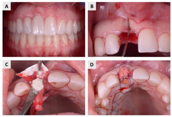 Surgical protocol in the control group. (A) A hopeless maxillary lateral incisor. (B) After extraction, a detailed curettage was carried out and the integrity of the alveolar bone walls was checked. (C) Bovine xenograft mixed with autologous bone and placed into extraction socket. A resorbable membrane was placed buccally. (D) Primary wound closure with connective tissue graft.