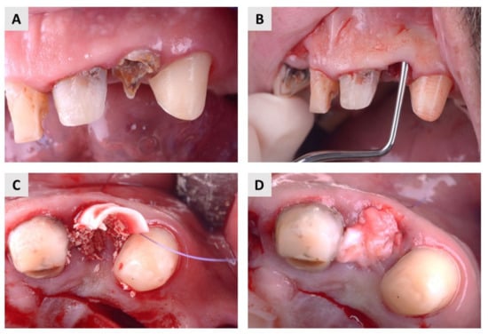 Surgical protocol in the test group. (A) The patient suffered from internal root resorption of the maxillary central incisor. (B) After atraumatic extraction, the integrity of the alveolar bone walls was checked with a dental probe. (C) An autologous dentin graft was placed in the extraction socket and covered with a resorbable membrane. (D) Finally, the wound was primary closed with connective tissue graft.