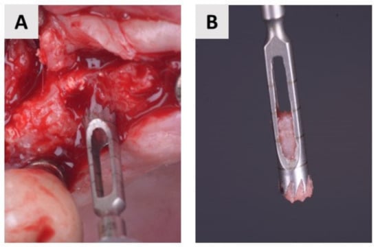 Biopsy collection. (A) Trephine bur in maxilla. (B) Closer view of the bone sample.