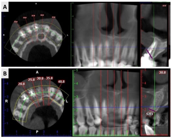 CBCT assessment protocol. The buccolingual dimension was measured between the most prominent points buccally and orally (purple marked line) at two time points—before extraction (A) and four months after (B).