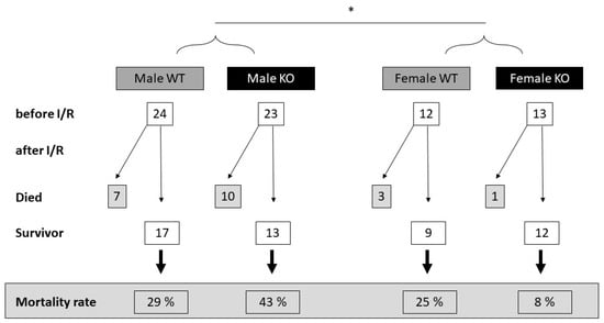 Higher mortality rate in male wild-type (WT) and cardiomyocyte-specific MAO-B knockout (KO) mice compared to female mice. WT and KO hearts were exposed to 45 min ischemia and 120 min reperfusion. Summary of the number of operated mice before and after surgery. Excluded mice had blood in the urine or surgery complications. There is no significant difference among groups when analyzed groups separately by Chi-square test or between WT and KO animals when analyzed by Fisher’s exact test. However, there is a slightly decreasing tendency but not significant in all-cause mortality in female individuals as compared to males when analyzed by Fisher’s exact test (* p = 0.103).