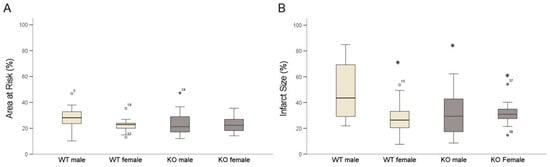 Male MAO-B KO mice benefit from MAO-B deletion regarding reduced size of infarcted area. (A) shows quantification of area at risk and (B) infarct size quantification. (WT male n = 14; WT female n = 9; KO male n = 11; KO female n = 11). Data are represented as box plots expressing median, 25% and 75% quartiles, upper and lower whisker and outliers. * p < 0.05 WT male vs. WT female, KO male, KO female, Student’s t-test.
