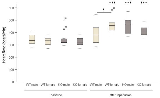 ). * p < 0.05, *** p < 0.001 baseline vs. after reperfusion, Student’s t-test. Two-way ANOVA: p < 0.001, baseline vs. after reperfusion p < 0.001, genotype * sex p = 0.02.