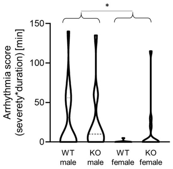 In addition, the differences in the number of reperfusion arrhythmias were measured among the different groups (Figure 4). The incidence and severity of the arrhythmias were evaluated according to convention 23 of the Lambeth conventions II [43]. The male mice displayed more severe arrhythmias than the females as evaluated by the arrhythmia score. The arrhythmia score was calculated according to the phenotype and duration of the arrhythmias. The ventricular premature beats (1), ventricular bigeminy (2) and ventricular salvos (3) were scored; however, neither ventricular tachycardia nor fibrillation occurred in any of the individuals. The duration of the arrhythmias was expressed in minutes. In the cases where several occurrences of different types of arrhythmias were found in one individual, the most severe arrhythmia with the longest duration was used for the analysis. The data are expressed as a violin plot and analyzed by the Kruskal–Wallis test (four groups) as well as by Mann–Whitney non-parametric tests (when the difference between the males and females was tested). The Mann–Whitney test resulted in only a decreasing tendency in the WT female mice as compared to the KO male mice (p = 0.054). However, when the WT and KO males as well as the WT and KO females were united, the Mann–Whitney test showed a significantly decreased arrhythmia score in the female mice as compared to the males (p = 0.014), regardless of gene modification.