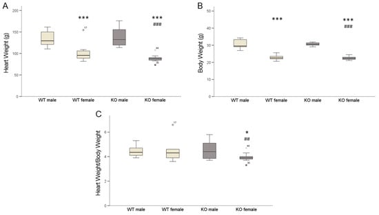 The female mice had reduced heart weights (HW) and body weights (BW) compared to the male mice (Figure 5A,B). The HW/BW ratios were similar in the WT males and females (Figure 5C) as well as in the male cardiomyocyte-specific knockout (KO) mice, while in the female KO mice the HW/BW ratio was reduced compared to the male mice.