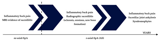 Axial-SpA may evolve over time, from an early phase without radiologically detectable changes in the pelvic X-ray (nr-axial-SpA) toward a late phase in which structural changes such as sclerosis, erosions, and new bone formation in the sacroiliac joints and in the spine occur (r-axial-SpA).