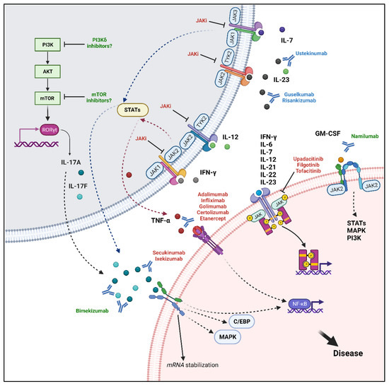 Molecular targets and associated signalling pathways. Current therapeutic targets in axial-SpA include TNF-α, IL-17A, and JAKs. TNF-α signals mainly through the NF-κB pathway and could be inhibited by several monoclonal antibodies, anti-TNF-α, and the fusion protein etanercept. IL-17A has a pivotal role in mediating disease pathogenesis and could activate several pathways such as the canonical NF-κB, MAPK, C/EBP pathways and the alternative stabilization of mRNA. Secukinumab and ixekizumab can bind IL-17A with different affinities, inhibiting its downstream actions. The JAK inhibitors upadacitinib, filgotinib, and tofacitinib may act directly by blocking the signal transduction of proinflammatory cytokines including IFN-γ, IL-6, IL-7, IL-12, IL-21, IL-22, IL-23, or indirectly blocking TNF-α and IL-17A/F production following inhibition of upstream stimuli. New targets include the simultaneous inhibition of IL-17A and IL-17F with bimekizumab. Moreover, a potential therapeutic strategy may be represented by GM-CSF inhibition through namilumab. Finally, the PI3K/Akt/mTOR pathway has important immunomodulatory roles, it can elicit RORγT translocation into the nucleus, promoting IL-17A/F production and could be further investigated as a novel target. “Created with BioRender.com”.