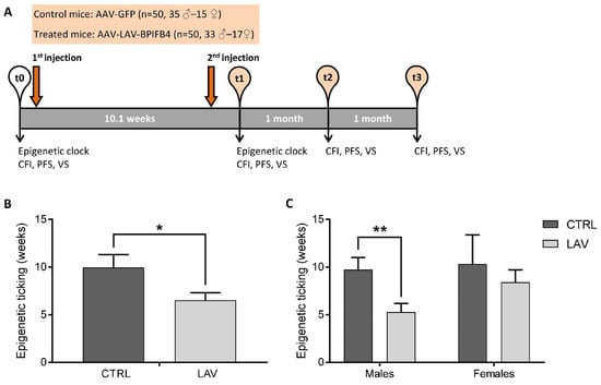 The epigenetic age was measured through the three CpG clock method [] in blood cells of aged mice before (time 0, t0; age: 19.2–26.6 months) and after (time 1, t1; age: 21.5–29 months) two i.v. injections of LAV-BPIFB4 or GFP (control) -encoding adeno-associated viral vectors (AAV) (Figure 1A). The epigenetic ticking, i.e., the difference of the epigenetic age between the t1 and the t0, was then calculated for each mouse. The gene therapy with LAV-BPIFB4 resulted in a significant reduction of epigenetic ticking. Control mice showed an average epigenetic ticking of 9.963 ± 1.358 weeks, comparable with the difference in chronological age between the pre- and post-treatment period (10.1 weeks), while in mice injected with LAV-BPIFB4, the average epigenetic ticking was reduced to 6.526 ± 0.780 weeks (Figure 1A). Such effect was predominant in males and not significant in females (Figure 1B). With an average ticking value of 5.292 ± 0.898 weeks, the epigenetic aging was slowed down by more than four weeks in males by the systemic treatment with LAV-BPIFB4.