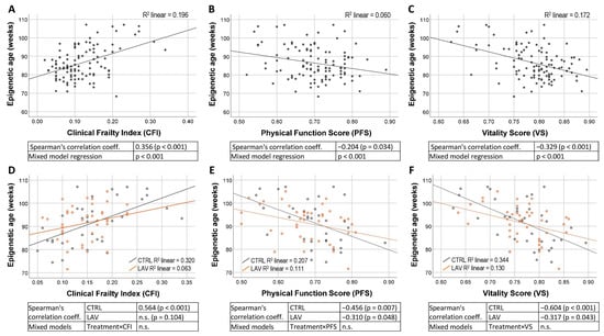 Correlation between the epigenetic age and the frailty scores. (A–C) Relationship between epigenetic age and CFI (A), PFS (B) and VS (C) evaluated in untreated mice (all mice at t0 and control mice at t1) using Spearman’s correlation and mixed model analysis for repeated measures. The regression equations estimated through the mixed model are reported: y = 70.2x + 78.2 for CFI (A), y = −29.0x + 106.7 for PFS (B) and y = −68.4x + 140.5 for VS (C). (D–F) Correlation between the epigenetic age and CFI (D), PSF (E) or VS (F) in control (CTRL) and treated (LAV) mice in the post-treatment period (t1). The R2 coefficients are shown on each graph. Correlation coefficients and p values analyzed by Spearman’s correlation and mixed models are indicated. n.s. = not significant.