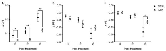 Values of ΔCFI, ΔPFS and ΔVS were obtained by calculating the difference of the respective score between the post-treatment (t1, t2 or t3) and the t0 time-point.
