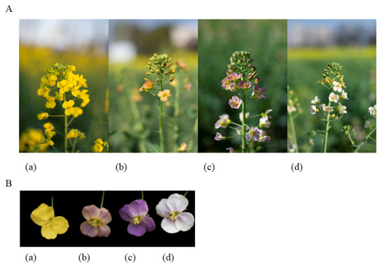 The phenotypes of the four differently-colored flowers of Brassica napus (A) The wild phenotype (B) Rapeseed petals. (a) Yellow petals, (b) yellow/purple petals, (c) purple petals, (d) light purple petals.