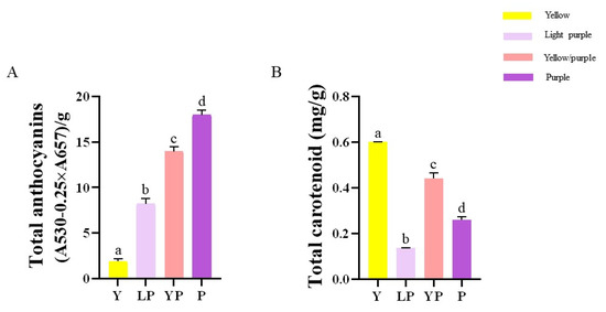 The contents of anthocyanins in LP, YP, and P petals were significantly higher than that in Y petals. The contents of carotenoids in the three purple petals were significantly lower than that in Y petals. These results indicated that anthocyanin contents were higher in deep purple petals, whereas deep yellow petals had higher carotenoid contents (Figure 2).