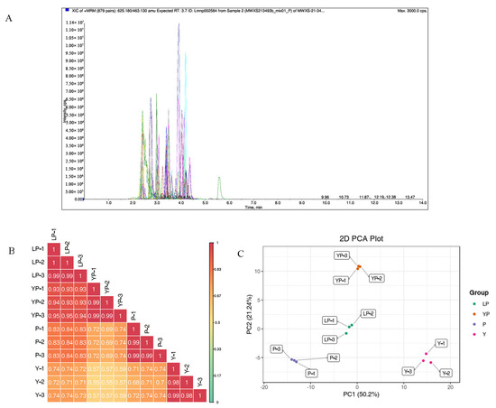 Overall qualitative and quantitative analyses of metabolomics data. (A) TIC overlap map of QC samples by MS detection. Abscissa represents the retention time (min) of metabolite detection. Ordinate represents the intensity of ion current (cps: count per second). (B) Pearson’s correlation coefficients among Y, LP, YP, and P. (C) PCA of Y, LP, YP, and P. X-axis represents the first principal component. Y-axis represents the second principal component.