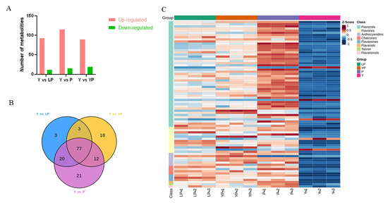 Analysis of differential metabolites. (A) The upregulated and downregulated differential metabolites in different petal groups. (B) Venn diagram of upregulated differential metabolites in different petal groups. (C) Heatmap of the differential metabolites. Red bars indicate highly accumulated metabolites, and blue indicates less accumulated metabolites.