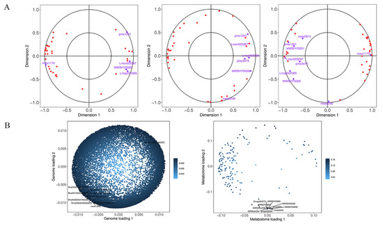 (A) Canonical correlation analysis (CCA). From left to right, Y vs. LP, Y vs. YP, Y vs. P. (B) Left, transcriptome loading plot; right, metabolome loading plot.