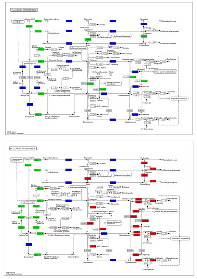 However, carotenoids are not central to the purple flower traits [21]. There is a need for further studies to unravel the potential role of flavonoids on the color of B. napus flowers. Flavonoid biosynthetic pathways have been extensively characterized in higher plants. Herein, RNA-Seq technology identified 33 genes that were differentially expressed in different B. napus cultivars (Figure 8), indicating that the different colors were regulated by specific genes. In the anthocyanin biosynthetic pathway, trans-cinnamic acid is initially formed through the deamination of phenylalanine by phenylalanine ammonia-lyase (PAL). Cinnamoyl-CoA and p-coumaroyl-CoA are then produced in a reaction catalyzed by 4-coumarate-CoA ligase (4CL) and trans-cinnamate 4-monooxygenase (C4H) [22]. Next, p-coumaroyl-CoA is isomerized to flavanone, catalyzed by chalcone synthase (CHS) and chalcone isomerase (CHI) [23]. Finally, the flavanones are converted to dihydroflavonols, catalyzed by flavanone 3-hydroxylase (F3H). According to the transcriptome analysis results, the expression of C4H and CHI was significantly decreased in purple and light purple-colored rape petals compared to yellow rape petals. Dihydroflavonols are converted into pelargonidin, cyanidin, and delphinidin, involved in anthocyanin biosynthesis, catalyzed by flavonoid 3′, 5′-hydroxylase (F3′5′H), flavonoid 3′-monooxygenase (F3′H), dihydroflavonol 4-reductase (DFR), anthocyanidin synthase (ANS), and flavonoid-O-glycosyl-transferase (UFGT).