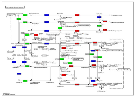 KEGG pathway analysis of flavonoid biosynthesis pathway. From top to bottom, Y vs. LP, Y vs. YP, Y vs. P.