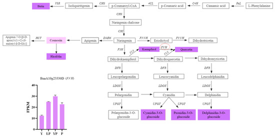 The flavonoid biosynthetic pathway. Heat maps of the DEGs between LP, YP, P, and Y. The light purple and purple boxes indicate significantly upregulated/downregulated metabolites in the flavonoid metabolic pathway. The F3’H gene (BnaA10g23330D) circled in red is the key differential gene in the flavonoid pathway that regulates purple flower traits.