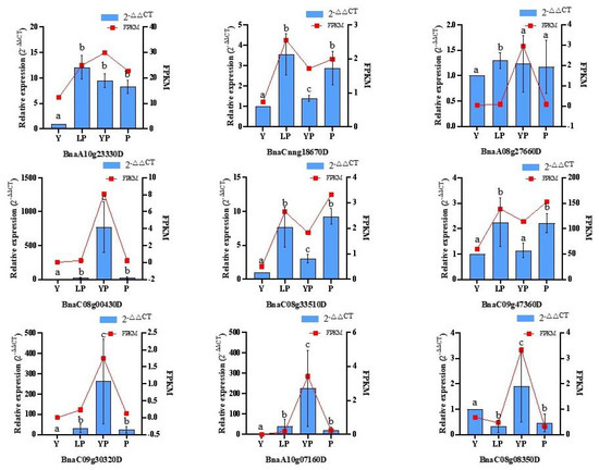 qRT-PCR analysis of selected DEGs in the rapeseed petal subtypes, identified by transcriptome analysis. Note: Y represents a yellow petal line; LP represents a light purple petal line; YP represents a yellow/purple petal line; P represents a purple petal line. BnaA10g23330D: BnF3ʹH; BnaCnng18670D: BnVSR; BnaA08g27660D and BnaC08g00430D: BnHCT; BnaC08g33510D: BnFLS; BnaC09g47360D: BnF3H; BnaC08g08350D, BnaC09g30320D and BnaA10g07160D: BnUFGT. Fold Change: Take Y as the reference point. Internal reference gene: β-actin. Data are means ± SD obtained from three biological replicates. Different letters above the error bars indicate significant differences at p < 0.05, according to Tukey’s test.