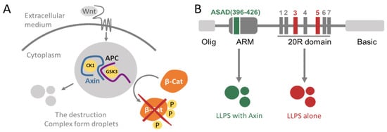 - Li, T.M.; Ren, J.; Husmann, D.; Coan, J.P.; Gozani, O.; Chua, K.F. Multivalent tumor suppressor adenomatous polyposis coli promotes Axin biomolecular condensate formation and efficient beta-catenin degradation. Sci. Rep. 2020, 10, 17425. [Google Scholar] [CrossRef] [PubMed]