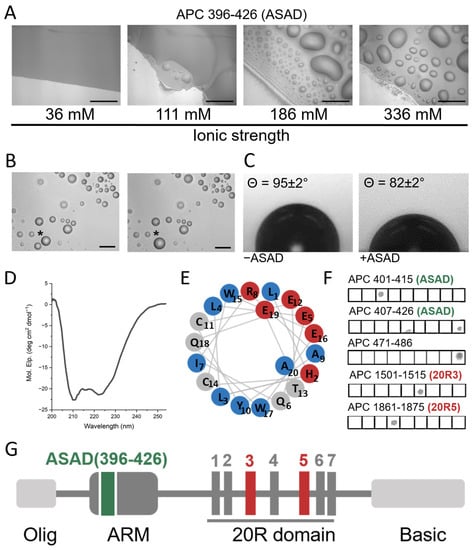 To determine the role of the ASAD in the LLPS of APC, we examined whether the ASAD could form droplets by itself. A peptide corresponding to the ASAD (APC 396–426) formed droplets as observed by differential interference contrast (DIC) microscopy, while fusion events of the droplets were monitored to confirm LLPS (Figure 2B). Increasing ionic strength enhanced the droplet formation of the ASAD. At an ionic strength of 336 mM, the ASAD rapidly formed a significant number of droplets, while at an ionic strength of 36 mM, it did not (Figure 2A). This suggested that ASAD droplet formation occurs via hydrophobic interactions. Upon adding the ASAD to buffer solutions on a hydrophobic surface, the contact angle was 82 ± 2° compared to 95 ± 2° for buffer alone, indicating that the addition of the ASAD enhanced the interactions of the solution with the hydrophobic surface, showing that the solution was more hydrophobic [] (Figure 2C).