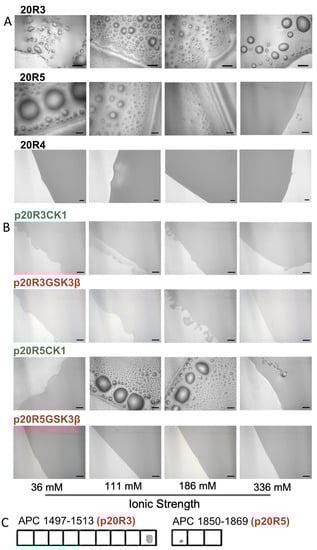 Next, we examined whether phosphorylation, a known PTM of APC in cells and an important regulation mechanism for LLPS, regulates droplet formation of the 20Rs. We examined if and how specific phosphorylation patterns corresponding to those of APC-phosphorylating kinases affected the droplet formation of the 20R peptides. We synthesized the 20R3 and 20R5 peptides with phosphorylated serine at sites known to be phosphorylated by these kinases in cells (Figure 3A). The peptides with the phosphorylation patterns for GSK3-β were p20R3GSK3-β and p20R5GSK3-β and the peptides with the phosphorylation patterns of CK1 were p20R3CK1 and p20R5CK1 [] (Table 1), and their droplet formation was tested at several ionic strengths (Figure 3C). Neither p20R3GSK3-β nor p20R5GSK3-β formed droplets at any ionic strength. p20R5CK1 formed droplets at an ionic strength close to physiological values, suggesting that 20R5 phosphorylated by CK1 can form droplets in cells. However, at a lower ionic (36 mM) and higher ionic strength (336 mM), it did not form droplets. The p20R3CK1 peptide did not form droplets at any ionic strength.