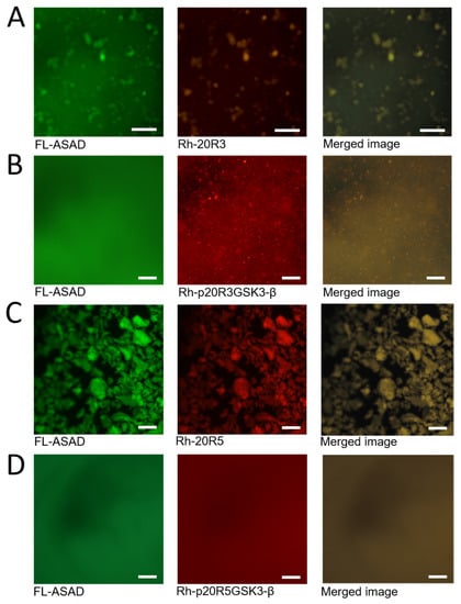 Using peptide arrays we discovered that the ASAD bound peptides derived from 20R3 and 20R5 domains even when they were phosphorylated in the GSK3-β phosphorylation pattern (Figure 4A). To understand the relationship between the interaction of the ASAD and the 20Rs and their ability to form droplets, we incubated the fluorescein-labeled ASAD peptide (FL-ASAD) with rhodamine B-labeled 20R peptides (Rh-20R3 and Rh-20R5). We detected aggregates of FL-ASAD in the presence of both Rh-20R3 and Rh-20R5 (Figure 4B,D). Unlike liquid droplets, these aggregates were not round and did not show the Brownian motion characteristic of LLPS droplets. In addition, we did not detect their fusion with each other. These observations support the conclusion that the ASAD and the 20Rs do not form droplets that result from LLPS when bound to each other. Merged images showed that the ASAD and the 20Rs co-localized in the same aggregates (Figure 4A,C, respectively). Together with results from the peptide array, this indicates that the ASAD and the 20Rs bind each other and co-aggregate. Next, we measured how the phosphorylation of the 20Rs affected their behavior when incubated with the ASAD. The ASAD was incubated with p20R3GSK3-β and p20R5GSK3-β. The phosphorylation of both 20Rs prevented co-aggregation with the ASAD, although small structures were still visible for p20R3GSK3-β (Figure 3B,D).
