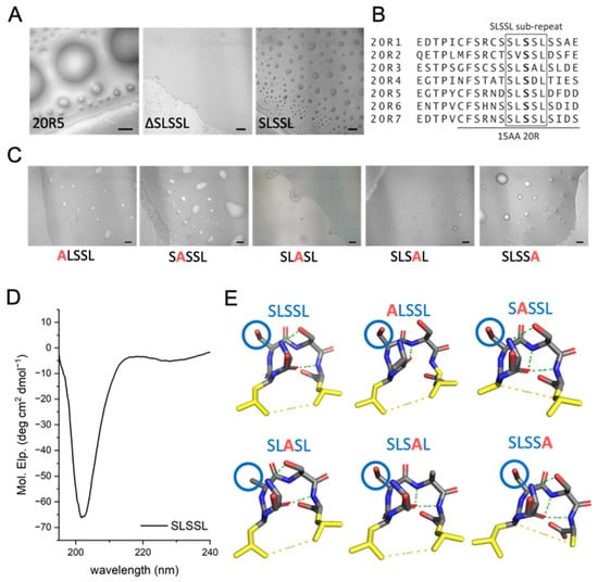 The SLSSL sequence, and particularly the 3rd serine in the sequence, are essential for LLPS of the 20R peptides. (A) Imaging of 20R5, SLSSL, and ΔSLSSL using DIC microscopy reveals an important role for SLSSL in droplet formation of 20R5. Scale bar = 20 μm. (B) Sequence alignment of all the 20R peptides show that the SLSSL, especially the 1st and the 3rd serines, are present in all 20R repeats. (C) Alanine scan of SLSSL at an ionic strength of 36 mM showed that ALASL, and SLSAL did not form droplets, while ALSSL, SASSL, and SLSSA formed droplets. Scale bars = 20 µm. (D) CD spectrum of SLSSL sub-repeat shows that it has a minimum at 203 nm, suggesting it forms a β-turn secondary structure. (E) Predictions from PEP-FOLD3 [] show that all of the SLSSL peptides produced by alanine scanning are predicted to have a β-turn secondary structure. The 3rd serine is labeled with a blue circle.
