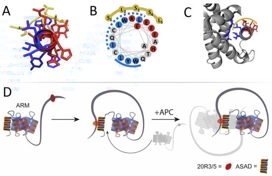 A scheme of the proposed self-association process of APC mediated by residues ~350–2000 spanning the ARM and 20R domains. (A) A prediction of the ASAD (red and blue helix) binds the SLSSL repeat (dark yellow) via both hydrophobic and charged patches. (B) A wheel projection of the ASAD, showing its two hydrophobic patches, 1 and 2 (dashed and solid blue lines, respectively). SLSSL repeat binds the ASAD via its first hydrophobic patch and the charged patch, possibly promoting separation of the ASAD from the ARM domain. (C) Crystal structure [] of the ARM repeat (gray) shows that the ASAD (red and blue helix) binds the following helical repeat by its second hydrophobic patch, which does not bind SLSSL. (D) 20R3/5 (red circles represent either 20R3, 20R5, or both) binds the ASAD (yellow). Upon binding SLSSL, the first hydrophobic patch (dashed line, Figure 6B) dissociates from the ARM repeat. The disassociation of the second hydrophobic patch of the ASAD (solid line, Figure 6B) is required for APC oligomerization by binding the ASAD from another APC molecule (light gray).