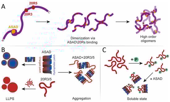 The droplet formation of 20R5 occurs at a physiological and lower ionic strength, suggesting this LLPS is mediated by electrostatic interactions. On the other hand, LLPS of 20R3 was not affected by ionic strength to the same degree. These differences can be explained by differences in their sequences. First, the consensus SLSXL repeat of 20R3 has alanine on the 4th position, while 20R5 has a serine. This alone could affect the LLPS of both peptides. Furthermore, 20R5 is highly charged (33.3%) and polar (33.3%), and droplets formed by 20R5 are more likely to interact electrostatically. 20R3 is less charged (13.3%), and more polar (40%), which is consistent with the fact that its ability to form droplets was less affected by ionic strength. The 20R3 peptide we used formed droplets at identical PEG and ionic strength conditions to those reported for the longer 20R2-3 []. This suggests that the polarity and/or the relative charge of individual droplet-forming domains affect the details of the LLPS. Droplet formation by the SLSXL sequence is consistent with previous work showing that LLPS is driven by hydrophobic residues, linked by a polar spacer [,]. Consistently, 20R4 did not form droplets at any ionic strength, showing that not all the 20R repeats form droplets and emphasizing the importance of 20R3 and 20R5 for the process. 20R4 has an aspartic acid as the 4th residue of the SLSXL repeat, which is consistent with the idea that the 3rd and 4th serine within the SLSXL sequence are essential for droplet formation. Our results can explain the lack of droplet formation when the 20Rs and the ASAD were incubated together. The ASAD has both charged and hydrophobic patches. It undergoes LLPS by hydrophobic collapse, resulting in a hydrophobic core with a charged surface toward the polar solvent (Figure 7B). Binding of the SLSXL repeat to the ASAD via both its polar and hydrophobic patches may not allow the ASAD to bind itself via the hydrophobic patches that are necessary for its LLPS, thus preventing droplet formation when incubated together.