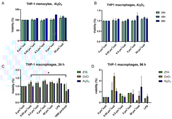 Al2O3 and ZTA particles do not affect THP-1 macrophage viability. Cell viability was measured by MTS assay. THP-1 monocytes (A) and THP-1 macrophages (B) were treated with Al2O3 particles for 24, 48, and 96 h (A). THP-1 macrophages were treated with ZTA, CoCr, or Al2O3 particles for 24 h (C) and 96 h (D). The results are represented as relative values in which untreated cells represent 100% viability. At least three biological repeats are depicted. The results are expressed as the mean ± SEM. *—p < 0.05.