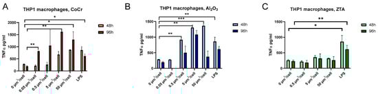 TNF-α secretion by THP-1 macrophages is activated by CoCr and Al2O3 particles but not by ZTA particles. THP-1 macrophages were treated with the test particles for 48 h or 96 h, and the concentration of secreted TNF-α was measured in the cell supernatants by ELISA. Treatment with CoCr particles (A). Treatment with ZTA particles (B). Treatment with Al2O3 particles (C). LPS was used as a positive control. The results are expressed as the mean ± SEM. *—p < 0.05; ** p ≤ 0.01; *** p ≤ 0.001.