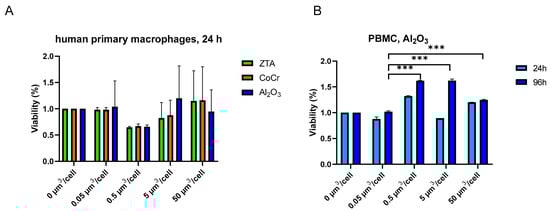 To evaluate how the test particles influence primary cells, we next performed experiments on human PBMCs and macrophages. First, to check whether particles affect viability of primary macrophages and human PBMCs, an MTS assay was performed 24 h post-treatment (Figure 3). Primary macrophages from two donors and human primary PBMCs from one donor were included in the study (Figure 3A,B). None of the particles affected the viability of both primary cell types at 24 h treatment (Figure 3A,B). In some experiments, the viability of primary cells even increased in the presence of particles, yet the change was not significant (Figure 3B). Interestingly, when primary PBMCs were treated for 96 h with the same concentration of particles, Al2O3 caused an increase in viability (Figure 3B). In the presence of 0.5 µm3/cell of Al2O3 particles the viability increased by 47% (p = 0.0001) in comparison with untreated cells (Figure 3B). The results indicate that Al2O3, ZTA, and CoCr nanoparticles at the concentrations used in the study (0.05–50 µm3/cell) are not toxic for primary human macrophages or primary human PBMCs. In fact, Al2O3 even increased PBMC viability.