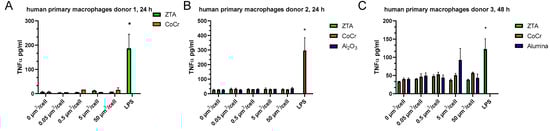 ZTA and CoCr particles do not induce TNF-α secretion in human primary macrophages. Human primary macrophages were treated with Al2O3, ZTA, or CoCr particles, and the level of TNF-α was measured in the supernatant 24 h (A,B) and 48 h (C) after addition of particles by ELISA. The results are expressed as the mean ± SEM. *—p < 0.05.