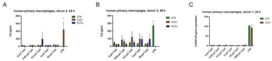 No significant particle-induced increase in IL-6 of primary macrophages from two donors was detected by ELISA (Figure 5A,B). Next, human primary macrophages were treated with CoCr and ZTA particles at concentrations of 0.05, 0.5, 5, and 50 µm3/cell, and the level of IL-8 was measured 24 h after treatment. Neither CoCr nor ZTA induced IL-8 gene expression in human primary macrophages from one donor (Figure 5C). Of note, the addition of the positive control LPS activated the release of IL-8 from the same cells.