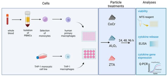 Given the controversy of previously published data, we hypothesized here that the toxicity of metallic oxide particles highly depends on the size composition of particles and varies between different cell types. Therefore, we compared the immunogenicity of Al2O3, ZTA, and CoCr particles by investigating THP-1 macrophages and primary human macrophages. In detail, viability, cytokine gene expression, and cytokine secretion of cells were investigated 24, 48, and 96 h after treatment with different concentrations (0.05, 0.5, 5, and 50 µm3/cell) of the test particles.
