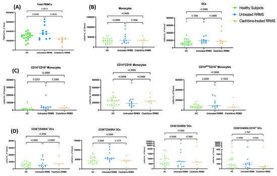 The absolute numbers of intermediate monocytes in untreated RRMS patients were significantly higher than in healthy subjects. However, the numbers of intermediate monocytes were not significantly greater in untreated RRMS patients compared to in oral-cladribine-treated RRMS patients. Additionally, there was no significant difference in the absolute numbers of classical, non-classical monocyte, immature and mature pDCs and CD38−CD45RA−CD197+ DCs among the three study groups (Figure 2C,D).